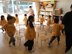 ばら組の保育室からダンスの練習をする音楽が…。発表会に向けて毎日練習を重ねています。