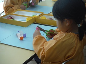 ばら組はひなまつりの制作でハサミを使っています。持ち方や切り方も上手になってきて、傍で先生が見守らなくても取り組めるようになってきました。