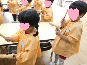 ばら組は楽器遊びをしました。初めて触れる、ウッドブロックやトライアングル、タンバリンに興味津々の様子。色々な音色を楽しみ、先生の弾く曲に合わせて簡単なリズム打ちもやってみました。
