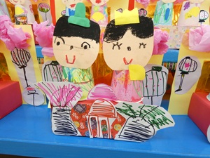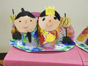 ホールのひな人形の周りに子どもたちの作品を飾りました。