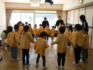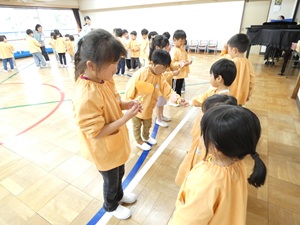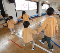今年度最後の「きらりんタイム」でした。チームごとにお昼ご飯を食べた後、全員でホールに集まって「お別れパーティ」をしました。内容は4月の「新入園児歓迎会」と同じで”ミッキーマウスマーチ”のダンスと”ロンドン橋”。1年前の歓迎会ではドキドキして参加出来なかったお友だちが楽しく踊る姿や、ぎこちなさがなくなって堂々とリードする年長児など、大きく成長した姿を沢山見ることが出来ました。終始リラックスした笑顔が溢れ、良い時間を過ごすことが出来ました。