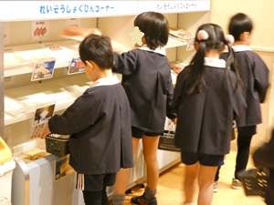 マーケットでお買い物体験。レジでバーコードを読み取り、レシートをもらいました。