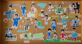 昇降口に年長児の子どもたちが自分の写真で作った「しょうらいのゆめ」を展示しています。みんながなりたいものになれますよ~に!