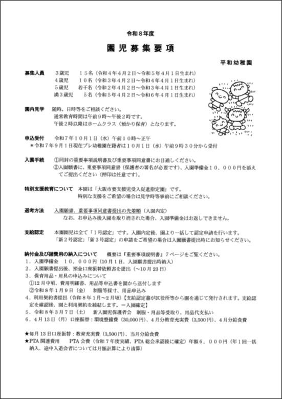 ☆令和7年9月1日(月)より【入園案内・募集要項・重要事項説明書・重要事項同意書等】をお渡ししています。郵送をご希望の方はお電話やメール等でお知らせください。