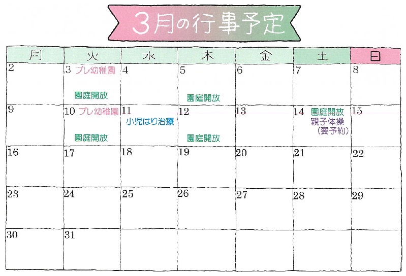 実施日・時間:毎週火曜日・木曜日(祝日及び幼稚園休業日を除く)午後3時から午後4時まで